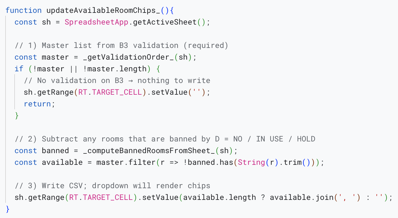 I built the Room Tracker System to eliminate a tedious, error-prone daily task at a busy wellness clinic. Using Google Sheets and a custom Apps Script I developed with ChatGPT and Claude, I turned a repetitive 20-minute process into a two-minute, reliable system that organizes and archives daily patient data automatically.